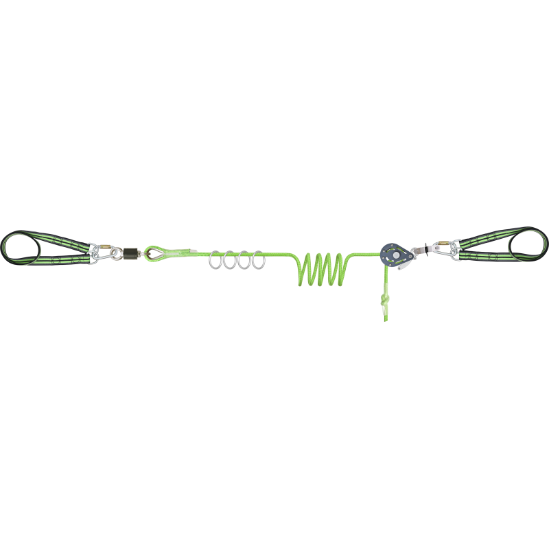 - Kernmantelseil (Durchm. 16 mm) mit einem spezifischen Seilspanner zur Spannung der Seilsicherung zwischen zwei Trägern.