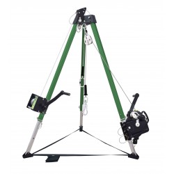 - Ausgestattet mit zwei Seilrollen, die am Kopfstück des Dreibeines als Verlängerung des Hauptbeins zum Durchziehen eines Seiles montiert sind.